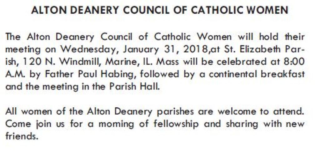 ALTON DEANERY COUNCIL OF CATHOLIC WOMEN MEETING TUESDAY, MARCH 21, 2017 HOLY ANGELS PARISH MASS - 8:00 A.M.